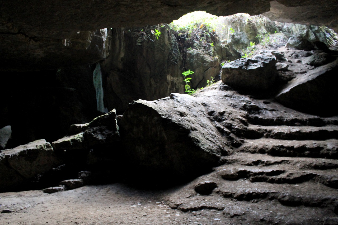 En la entrada se encuentra un sendero de piedra cubierto por una inmensa roca que hace las veces de techo, éste es el recibimiento al primer salón de la cueva.